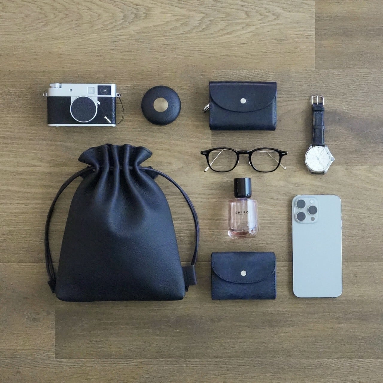 巾着型の柔和な印象とオールブラックの上品さが幅広いスタイルにフィットします。