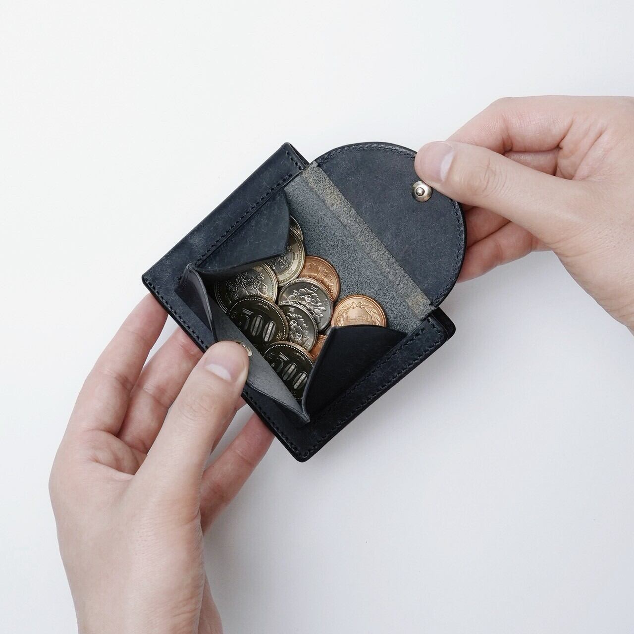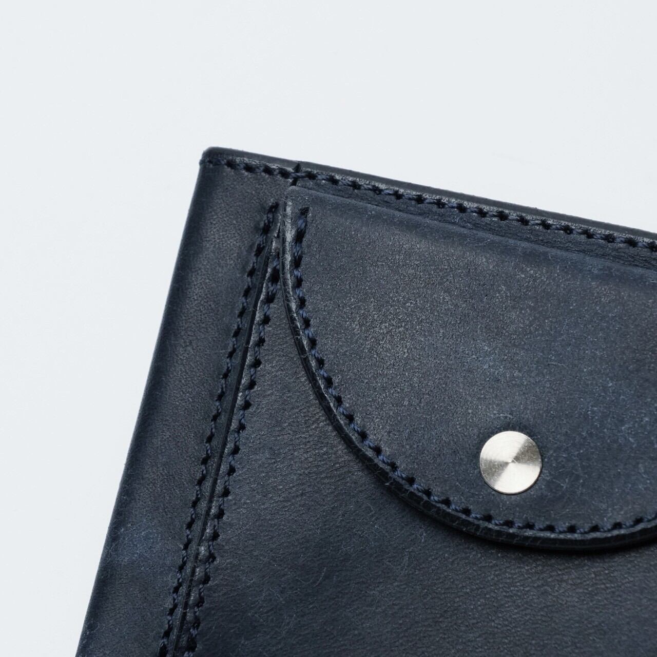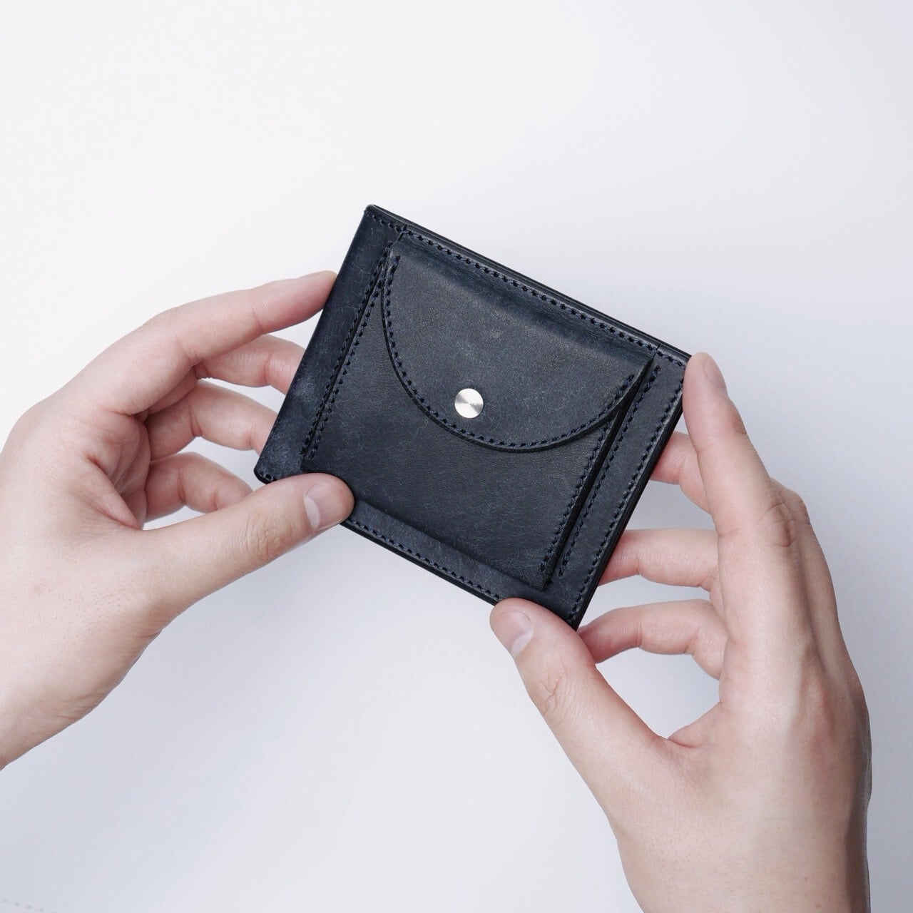 フラットなスナップボタンはより厚みを抑え、出し入れの際にポケットや鞄と干渉しにくいことも利点です。
